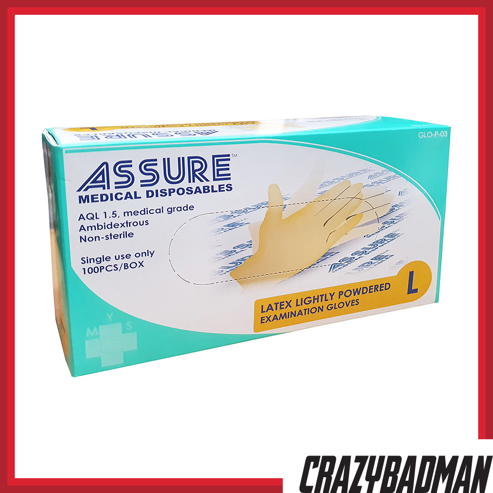 ASSURE Latex Gloves are manufactured in the highest required quality of AQL 1.5 Acceptable Quality Level (AQL), ambidextrous and perfect for examination purposes. Made from 100% Natural Rubber Latex.