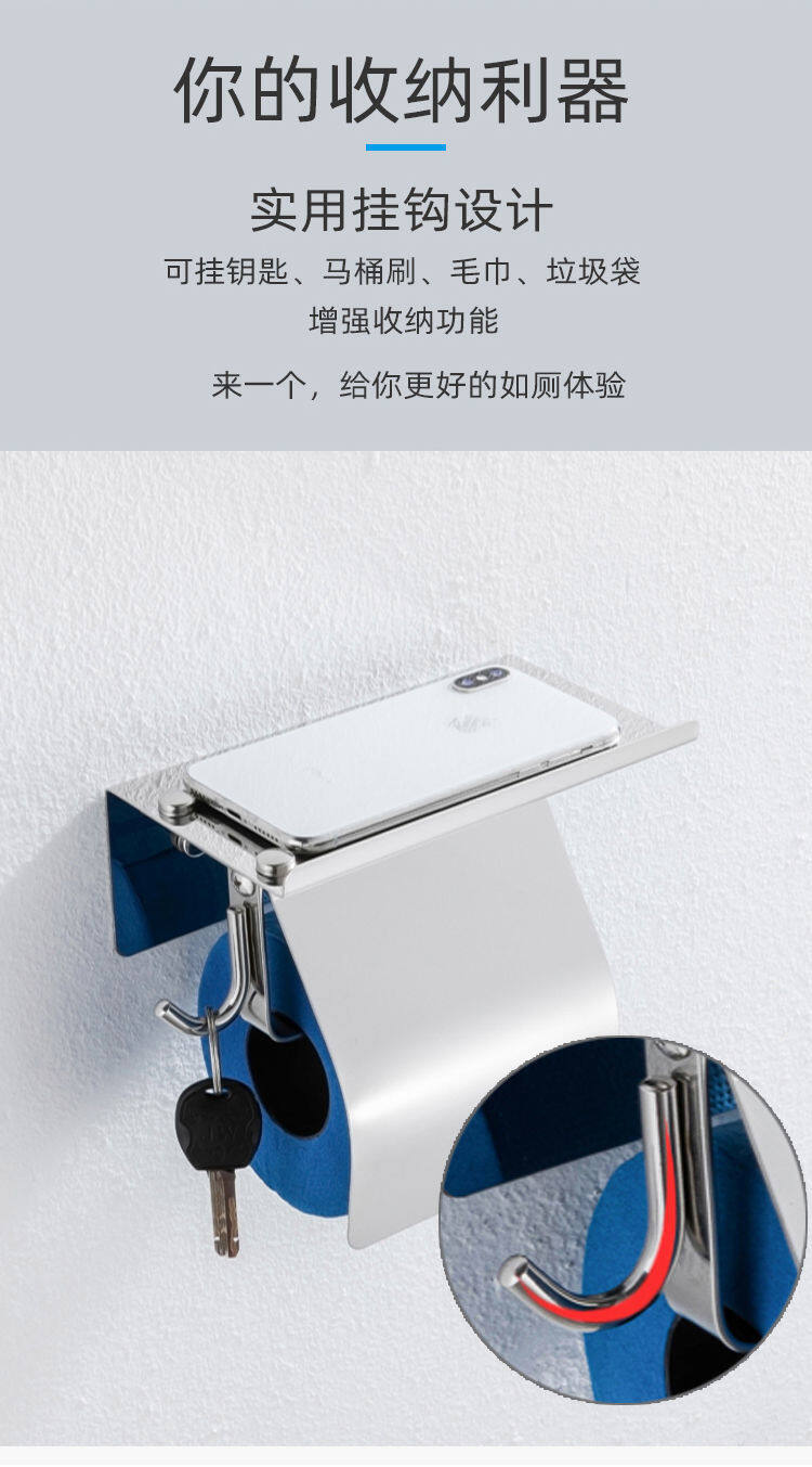 • Multi-functional tissue roll holder with shelf. It is not just a bathroom hardware paper hanger, and it is also a wall-mounted bath accessory with storage shelf for holding phones and other small items.