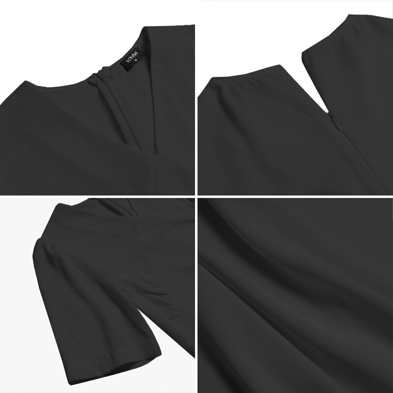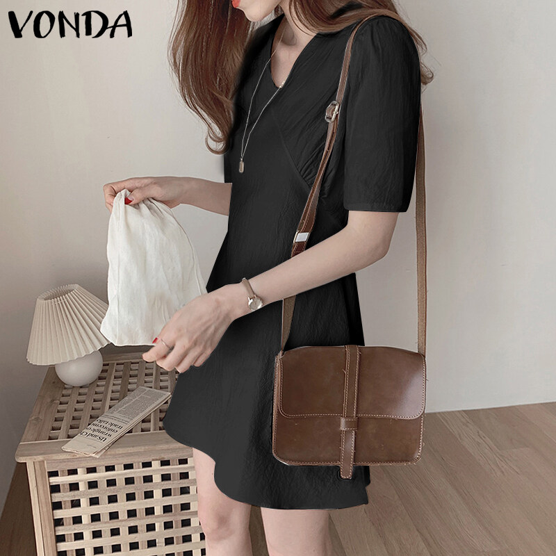 VONDA Women Casual Short Sleeve V Neck Holiday Plain Dress Fashion Pleated Party Short Dresses (Korean Causal)