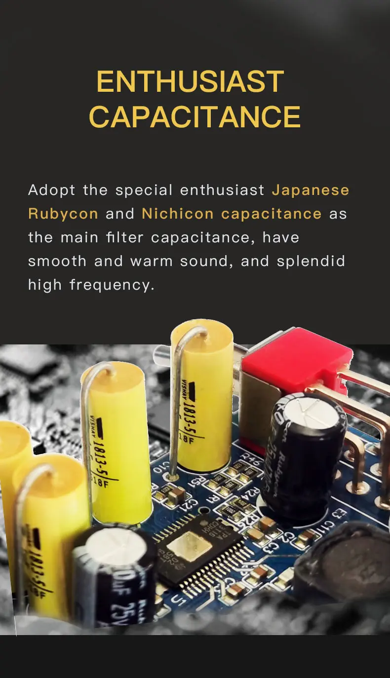 > xDuoo MT-605 adopts high-quality Japanese Rubicon and Nichicon capacitors as the main filter capacitance. They enable the amp to produce clean performance with splendid details and quality resolution.