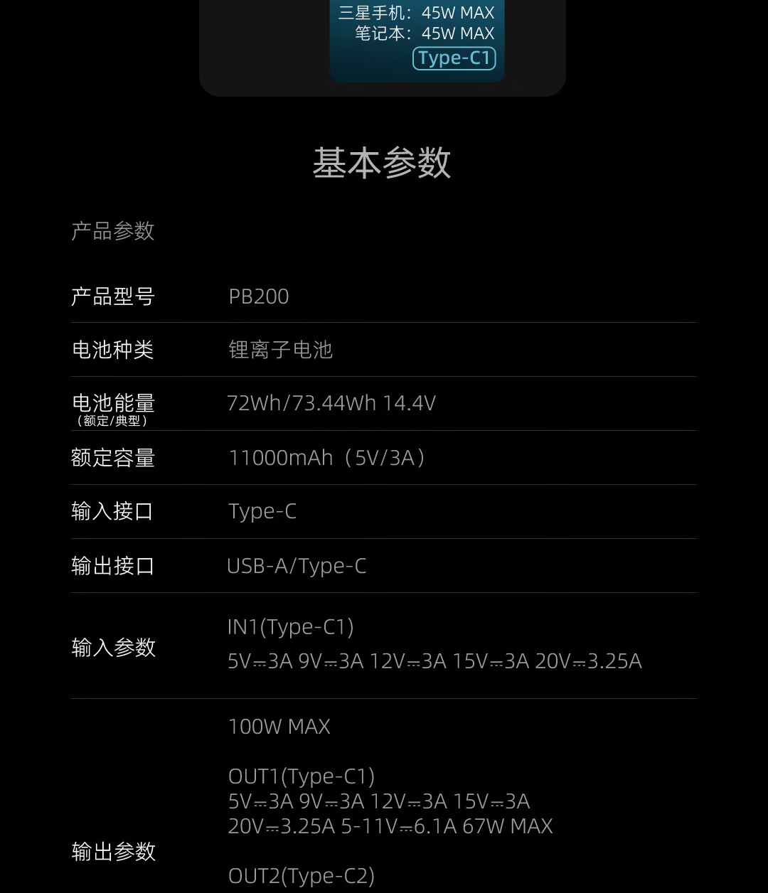 CUKTECI Power Bank 10SE Key Features Laptop Charging: 65W MAX Dual Port Power: 100W MAX Xiaomi Fast Charging: 67W MAX UFCS Compatibility Includes: 240W PD3.1 (6A) Type-C to Type-C Cable Airplane-friendly Product Specifications Model: PB200 Battery Type: Lithium-ion Battery Capacity: 72Wh/73.44Wh 14.4V Rated Capacity: 11000mAh (5V/3A) Input Port: Type-C Output Ports: USB-A/Type-C Input Parameters: IN1 (Type-C1): 5V=3A, 9V=3A, 12V=3A, 15V=3A, 20V=3.25A Output Parameters: 100W MAX OUT1 (Type-C1): 5V=3A, 9V=3A, 12V=3A, 15V=3A, 20V=3.25A, 5-11V=6.1A, 67W MAX OUT2 (Type-C2): 5V=3A, 9V=3A, 12V=3A, 15V=3A, 20V=3.25A OUT3 (USB-A1): 5V=3A, 9V=3A, 5-11V=3A, 33W MAX Operating Temperature: 5°C~35°C Dimensions: 152 x 52 x 44.4 mm Charging Time: About 2 hours (65W and above power charger, included Type-C to Type-C charging cable, IN1 port) About 5 hours (18W charger, included charging cable) Packaging List Power Bank: 1 Type-C to Type-C Cable: 1